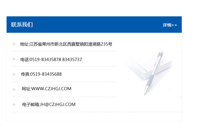 地址:常州市新北區(qū)友邦商務(wù)大廈1幢16、17層  電話:0519-85101652  傳真:0519-85112595  郵編:213022  網(wǎng)址:www_cz-jiayue_cn.weiyoub.com  郵箱:xiajifengaa@163.com